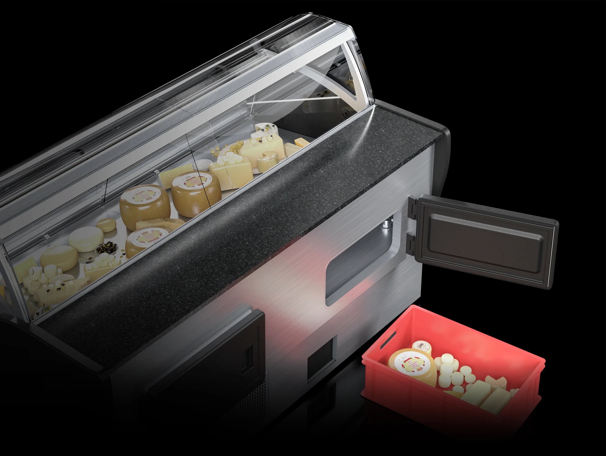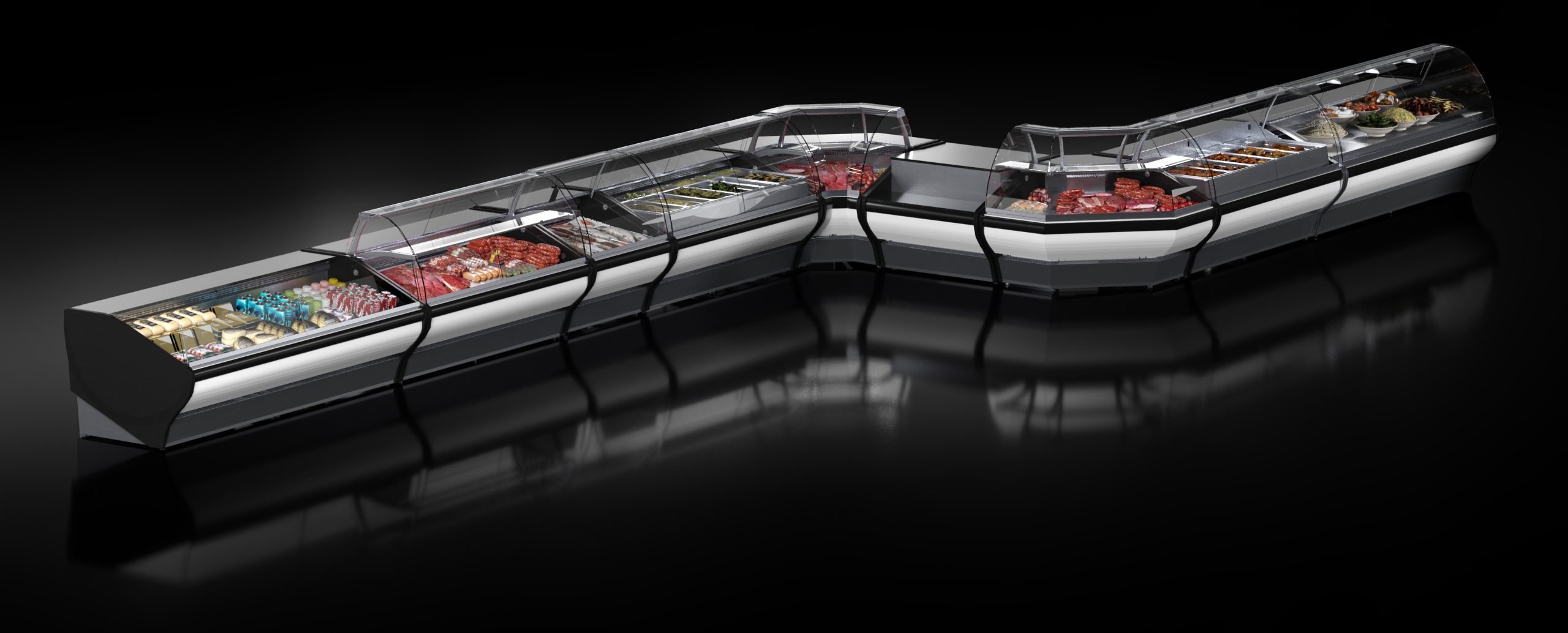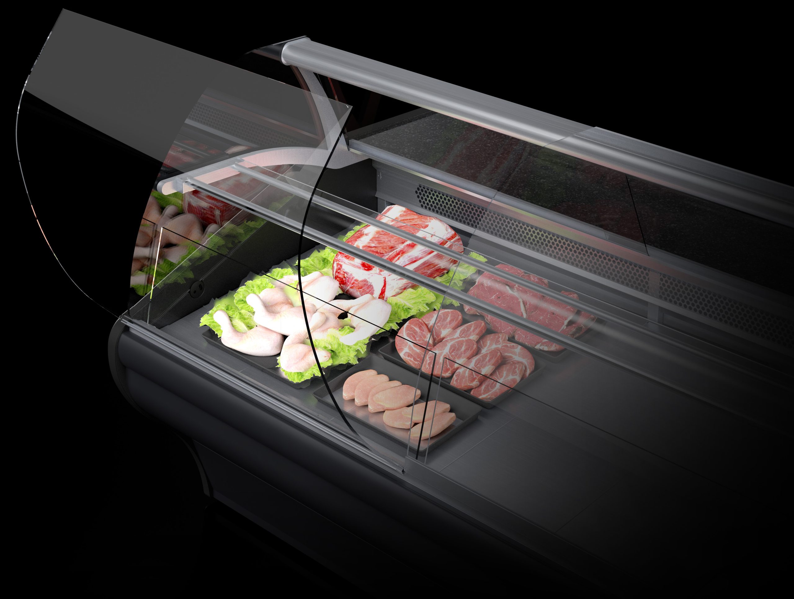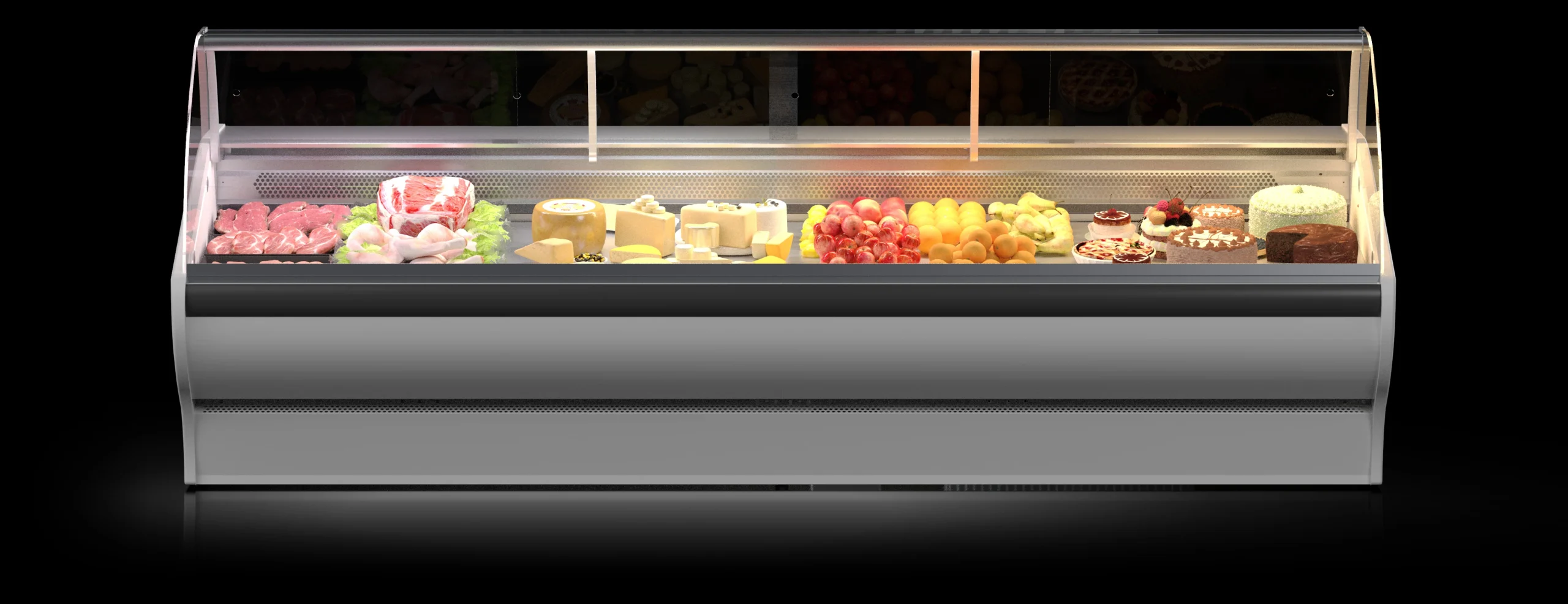 Dopasowane do rodzaju produktów oświetlenie LED podkreśla ich wygląd i zapewnia naturalne odwzorowanie kolorów – ciepłe dla mięs, neutralne dla nabiału oraz chłodne dla wyrobów cukierniczych. Dzięki temu ekspozycja w witrynie pozostaje czytelna i estetyczna.